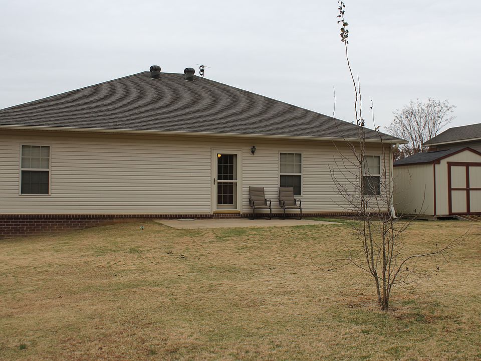 This home has so much to offer for your family! The kitchen is open to the living room with breakfast bar. The living area has a vaulted ceiling and laminate floors. Split bedrooms with new carpet. The master is large with a huge walk in closet, separate bath, walk in shower, and double vanity. Secondary bedrooms have new carpet as well. All new paint throughout. Fully fenced backyard with separate storage building. Building has electric too! Flat lot that backs up to green space. Call today!