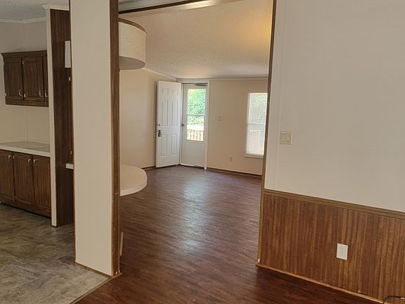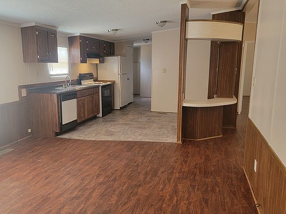 Freshly painted dblwide mobile home in older manufactured home community, fenced yard, stove, fridge, dishwasher, central heat and air, den and living room areas