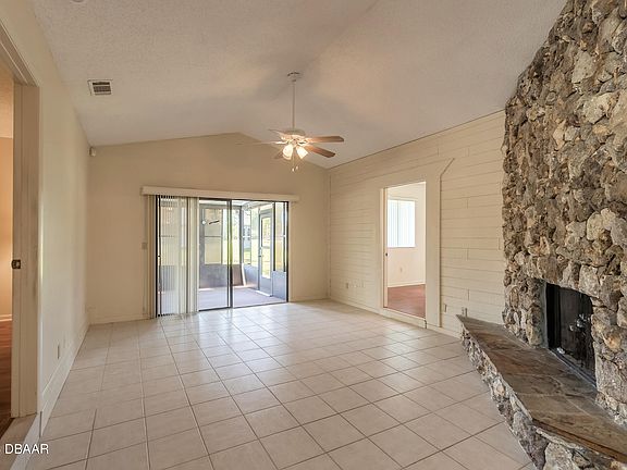 OPEN JULY 2nd 1-3 PM Situated in Pelican Bay ,a secure golf community surrounded by canals, and is conveniently located in the center of Daytona Beach. Upon entering you'll find a spacious foyer w/ample storage space and a living room with a cozy wood burning fireplace. The sliding doors lead out to a sizable 3 Season Lanai that provides stunning views of the canal. The kitchen is quite spacious, equipped with plenty of counters, cabinets, and an adjacent breakfast nook. The house features an indoor laundry area and formal dining space. The master bedroom is sizeable with a walk-in closet, an attached bathroom, and direct access to the Lanai. The other 2 bedrooms are located on the opposite side of the house. . The roof is 3 Years Old, HVAC less than 10 Years Old.