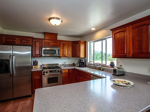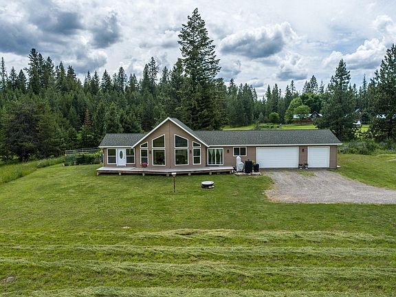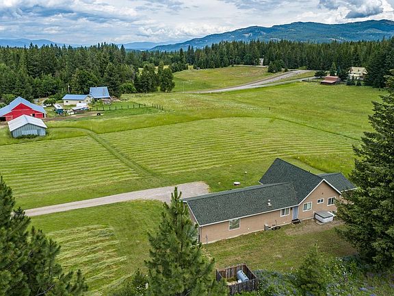 Well-designed home built in 2005 on 6 beautiful pasture acres. Gorgeous views of Schweitzer, Baldy Mtn., and Gold Hill through the picture windows in living area. Situated in very peaceful, private setting and less than 15 mins to downtown Sandpoint. Beautiful custom-made Cherrywood kitchen cabinets with Corian countertops. Open floor plan with knotty cedar Cathedral ceiling in living room. Hydronic in-floor heating throughout the home. Stubbed for propane to be hooked up for outdoor bbq, indoor fireplace & more. Attached 2 car garage and 48’x30’ barn on property. 3' tall crawlspace under house with moisture barrier. 400 amp underground service on property. House wired for generator. Plenty of water from the 15+ GPM private well. Property surveyed, pins in place. Outdoor hot water for washing cars or pets. Aprx. 4 acres in hay production. Established fenced garden with variety fruit & herbs. Nice large yard to play/entertain in. Imagine watching the stars while relaxing in the hot-tub.
