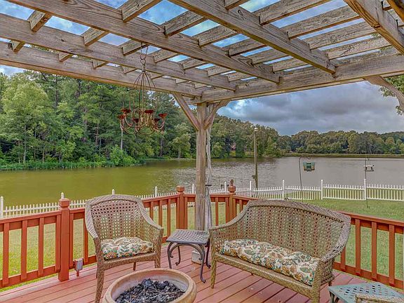 WATERFRONT PROPERTY WITH IMMACULATE VIEWS ON A PENINSULA WITH 4 +/- ACRES AND A SEPARATE OFFICE/WORKSHOP! This home has 1,800+/- sq/ft split floor plan with 3 bedrooms, 2 baths, built in gun safe closet, extended back porch and deck with amazing waterfront views. No covenants and the lake is stocked with fish. There is a formal dining room, spacious living room with built in fireplace, kitchen with lots of storage, breakfast area, laundry room. The master suite has a private entrance onto the back patio overlooking the lake. The master bath has double vanities, jetted tub, separate shower, and a walk in closet. There is a great outdoor space and a small fenced in area inside the property lines. There is a pier overlooking the lake! Come make this home your dream property today. Call today for your private showing!