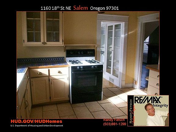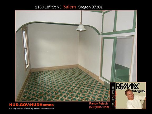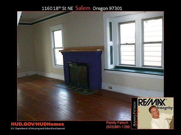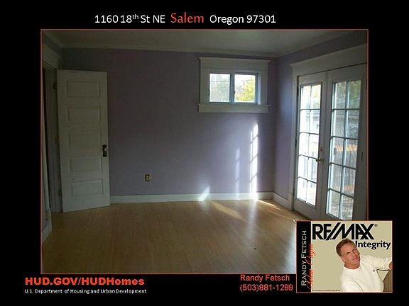 1160 18th St NE Salem Oregon 97301Desirable Englewood Area. Only 2 blocks from Englewood Park. Lots for unique charm and original design. Wood floors, built-in hutch and claw foot tub. Full unfinished basement w/sauna room. Large fenced yard w/alley access. HUD Owned & Sold As-Is. FHA eligible. $149,000RE/MAX Integrity - SalemRANDY FETSCHPhone: 503-881-12992110 Mission Street SE Salem Or. 97302State of Oregon licensed Real Estate BrokerU.S. Department of Housing and Urban DevelopmentHUD.GOV/HUDHomesWebsite -- www.RandyFetschHomes4Sale.com