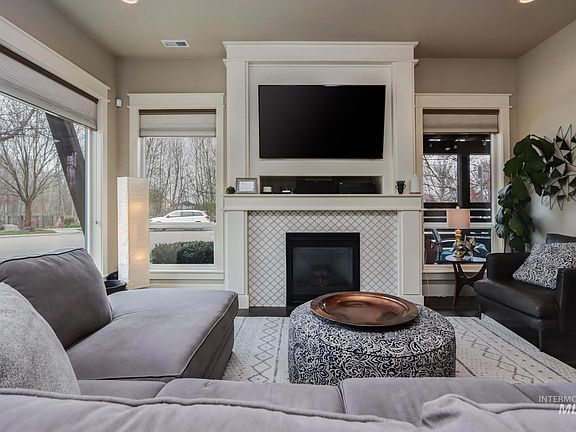 Beautiful custom carriage home- 2259 sq ft, 3 bed 2.5 bath in the heart of Eagle, the River District! Full kitchen remodel 2022, LVP flooring main level, wood-wrapped windows, 10 foot ceilings throughout. Open great room area w/ lots of natural light, gas fireplace. Large master w/ walk in closet.2 Office/work areas. Finished garage w/ stainless steel sink. Best of all MAINTENANCE FREE community!!! Fantastic corner lot, w/ privacy fenced covered patio, upper walk-out balcony off master w/ great views, jetted master tub, surround sound & home security system, hunter douglas blinds throughout. Community amenities- walking paths, 10 acres of common area, 3 private ponds for fishing and kayaking, access to greenbelt & Boise River. clubhouse w/pool & hot tub. Walking distance to the new indoor tennis facility, restaurants and down town Eagle.