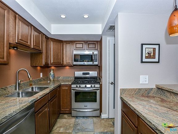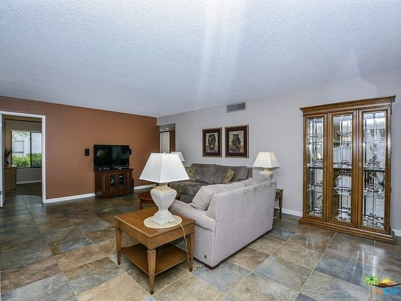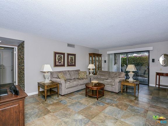 Absolutely gorgeous, turnkey condo! This entire unit has been updated with slate flooring, travertine bathrooms, granite counter tops, stainless steel appliances in the kitchen, stacked stone entryway and more. There are 3 sliders extending your living space to a beautiful (pebbletec floored patio) entertaining space - complete with granite topped built-in buffet and large BBQ. Furniture available outside of escrow. Just bring your clothes and move in! Rancho La Paz community in South Palm Springs is close to Smoke Tree shopping, a free shuttle ride to downtown, features community pool just steps from the unit, tennis, and is gated for security. This one will definitely not last long...