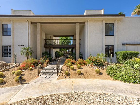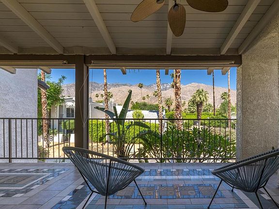 Great value alert! Looking for prime location, panoramic views and 3 bedrooms on fee simple land in South Palm Springs? Located in the desirable intimate gated community of Rancho La Paz in the coveted neighborhood of Deepwell Estates and conveniently close to many of the cool spots Palm Springs has to offer such as Ace Hotel, Koffi, L'Horizon, Elmers, Sparrows Lodge, Smoketree Plaza, Mr. Lyons, Bar Cecil, and minutes from downtown Palm Springs, this very spacious & quiet end unit top floor condo features nearly 1700 sqft of living space with many cosmetic updates. Enjoy beamed vaulted ceilings in living room, beautiful natural light in all rooms, great bedrooms separation, an open floor plan well-suited for entertaining, 3 large bedrooms (primary has an updated ensuite bathroom with a large tiled walk-in shower), a high-top breakfast bar & private laundry. The current owner used a beautiful selection of bright and cheery colors to complement the low maintenance tile floor throughout. Relax on the oversized private balcony with storage & custom design tile flooring accessible by 2 large sliders with shutters to frame the outstanding views of the manicured grounds and breathtaking San Jacinto Mountain vistas. The stylish yet understated community of Rancho La Paz offers 3 sparkling pool & spas, tennis and pickle ball courts, assigned covered parking, guest parking, a dog run and has a 30-day minimum rental restriction. This is Palm springs lifestyle at its best!