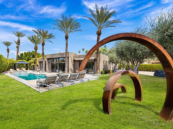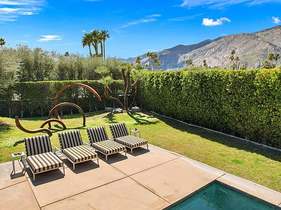 Open space and minimal adornment. Olive trees + citrus, poolside cabana, and the San Jacinto Mountains as your backdrop. This one-of-a-kind walled + gated compound is ready for its next stewards. A circular drive in the tradition of great country manors, manicured hedges, and the understated, yet elegant entry begin to tell the story. Clerestory windows at 14-feet tall provide a unique perspective. These views are the home's signature, defining moment. Each room opens to the garden, patio, or pool. Gallery-inspired lighting throughout. Gourmet kitchen w/ professional grade appliances, prep sink, and breakfast room w/ fireplace. Al fresco dining and barbecue just a few steps further. En suite bedrooms feature neutral finishes, walk-in closets, and tall ceilings. Saltwater pebble-finished pool + spa. Swaying palms, a hushed silence, and multiple conversation areas deliver just what the doctor ordered. Perfectly positioned cabana w/ modernist firepit. Outdoor shower finished in stone. The smell of citrus from the north end of the property is a delight. Motorized steel shutters and drop-down sunshades shade west-facing windows + doors. Another awning off the garage covers two vehicles. Leased solar in place. The best of walkable Movie Colony and Downtown Palm Springs are a short hop away. Enjoy it all!