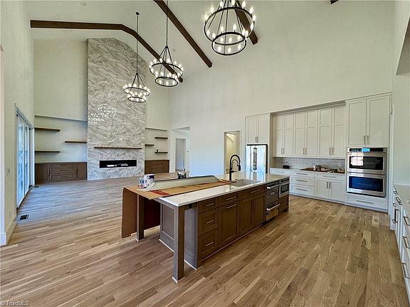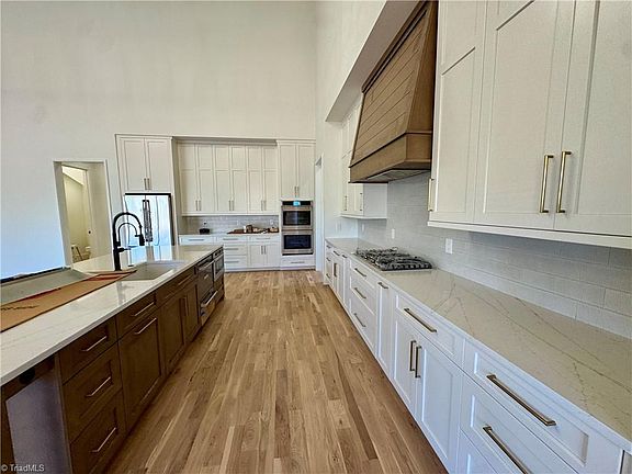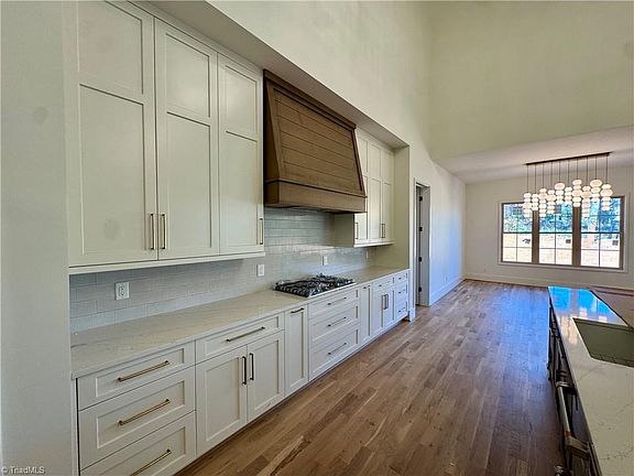 Welcome to luxury living in Waterford at Lake! This stunning new build by Wilson Homes offers 4 bedrooms, 3.5 baths, a main level study & 4,175 feet of thoughtfully designed space. Enjoy soaring 30’ cathedral ceilings, a dramatic tile-surround gas fireplace & hardwood floors throughout the main level. The chef’s kitchen features quartz countertops, a 10’ island custom cabinetry, stainless appliances & a walk-in pantry. Main-level primary suite includes walk-in closets, a freestanding tub & a tiled walk-in shower. 3 spacious bedrooms & a finished bonus room upstairs. Other highlights include a side entry 2 car garage, 10’ ceilings on main, 9’ on second, mudroom bench, covered rear porch & custom closets. Just minutes from I-40/70, Elon University, top-rated schools, dining, shopping, and Cone Hospital—this home truly has it all.
