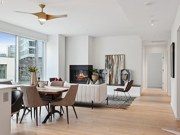 Sunny, south-facing condo with modern elegance, large windows framing treetop views of the lovely neighboring courtyard and streetscape, gas fireplace, White Oak floors, generous utility room, gourmet kitchen with Bosch appliances, wine cooler, and large kitchen island with eating bar. Fantastic floor plan with an office and separate bedroom suites on opposite sides of the living room, both with large walk-in closets, luxury bathroom finishes, and primary bath with double vanity and large shower. Concierge & security service 24/7 with luxury amenities including a fitness room, pet wash station, bike room, 2 lobbies, 2 guest suites, gorgeous community room and rooftop courtyard with fire pit, and BBQ. Includes deeded indoor parking & storage.