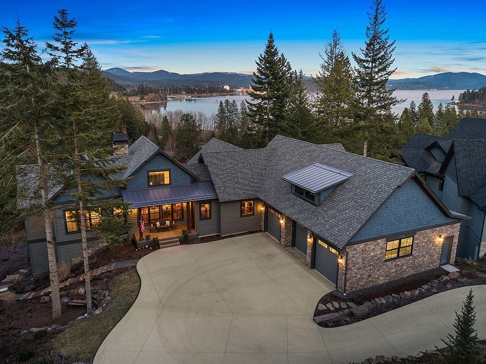 Welcome to Mountain Modern in the coveted, gated section of the Ridge at Cougar Bay, just 10 mins from downtown CdA! Designed & built to welcome friends & family, nearly every room has a captivating LAKE VIEW with all bedrooms (4) having en-suite baths, 4059 SF (includes lower-level of 1193SF + 658SF partially finished storage room), this home beautifully blends open contemporary design w/rustic luxury. Thoughtfully situated on .56 ac w/private setting, oversized 3 car garage (3rd bay is deep workshop) & meticulous attention to detail. Custom-built in 2021, with an open layout, the 22' high ceilings in the great room invite abundant natural light. Large decks on both levels provide seamless indoor-outdoor living. The walkout lower level is perfect for guests w/second family room, 2 BR suites, playroom, potential wine room & more. Large backyard is idyllic for lawn games or watching wildlife. Boasting custom high-end finishes, state-of-the-art appliances & more! Simply extraordinary!
