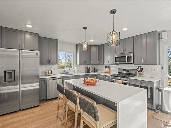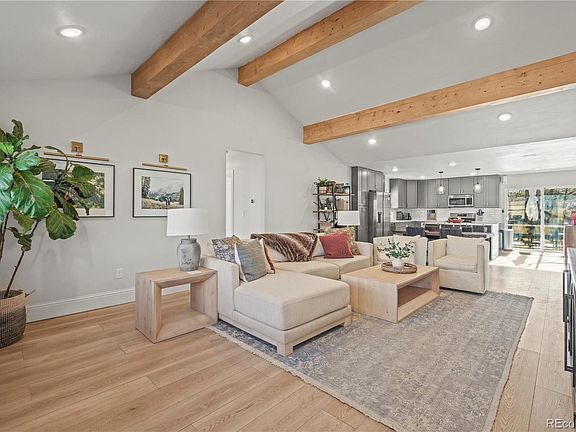 This stunning Mid-Century Modern ranch in Denver's Virginia Village has been completely remodeled, offering a spacious open floor plan with vaulted ceilings, exposed beams, and Hewn stoneform plank floors. The modern kitchen features quartz countertops, a waterfall island, and stainless steel appliances. The primary suite includes a five-piece bathroom with a soaking tub and walk-in closet. Three additional bedrooms are bright and spacious, including one that works well as an office with a murphy bed, complemented by a second full bathroom. Also featuring a new roof, new A/C, and a new water heater all in the last 2 years, you do not need to worry about mechanical systems upgrades! The backyard boasts a wood deck, large yard, and an oversized shed, giving you plenty of extra storage space. Located near the beautiful Potenza Park trails along Cherry Creek with easy access to shopping, restaurants, Cherry Creek, and the Denver Tech Center, this home has it all!