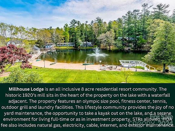 This residence is included in the MUCH ANTICIPATED PHASE II RELEASE of 13 units in this tranquil mountain getaway community! This gorgeous condo, Lake View Oasis, is aptly named as it is one of the most desirable residences in the Millhouse Lodge community. Most notably because of the beautiful room adjacent to the lake that features a vaulted ceiling, hardwood floors, original knotty pine walls, built-in shelves & a custom corner gas fireplace. Additionally, the large covered porch with slate floor overlooking the lake accented by a gorgeous cherry tree creates outdoor living space that no other residence in the village has. Kitchen is fully updated with luxury vinyl plank flooring, subway tile backsplash, granite countertops, & maple cabinets. All updated stainless appliances. Bathroom features a 5FT walk-in shower with glass doors, a pedestal sink & new tile. Exterior features include trex stairs to the front door & juliet balcony overlooking the waterfall. Units are sold furnished!