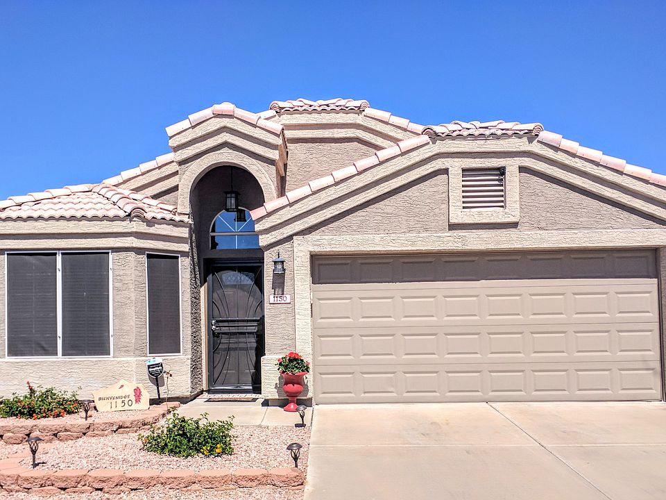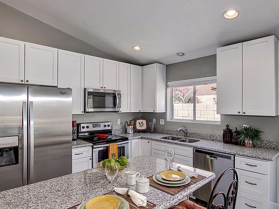 Your dream home is about to hit the market! Vaulted ceilings, tile flooring, and designer paint tones throughout. Decorative niches are great for displaying personal collections! Create a gourmet delight in the upgraded kitchen with stainless steel appliances, custom cabinets, granite counters, and center island w/breakfast bar. Four spacious bedrooms have plush carpeting. Master includes a walk in closet and spa like bath with garden tub, separate shower, and dual sink vanity. Covered patio overlooks the serene backyard with lush green grass and desert landscape!