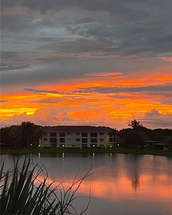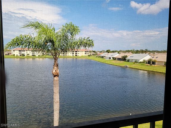 GORGEOUS LAKE FRONT CONDO in POPULAR CINNAMON COVE! Beautiful view of palm tree and sunsets from this corner END unit conveniently located in ONE of ONLY 4 BUILDINGS with VAULTED CEILINGS on the THIRD (top) FLOOR bringing a "living large" feeling when you come in the front door! Upgrades include so many nice features such as granite countertops, newer cabinets and Kitchen Aid stainless-steel appliances (2020) in an open and spacious kitchen, with porcelain tile, luxury vinyl plank flooring (2022) in the main living area and master bedroom, plantation shutters on all windows, electric hurricane shutters on the lanai and manual shutters on the windows, nice ceiling fans, neutral paint colors and NEW AC (Oct 2022) The lanai has acrylic shutters to AC and extend your living area and keep the rain out in the warmer summer months, perfect for morning coffee or evening cocktails watching the sunset over the lake. The guest bedroom has a built-in murphy bed. All this and low condo fee of only $433 month. Come join in the fun in with our full-time activities director in this resort style and very friendly community. Close to beaches, restaurants and more!