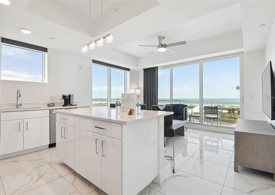 Welcome to your slice of paradise at Treasure Island's newest condo hotel! Nestled on the corner of the 5th floor, this pet-friendly 2 bedroom, 2 bath unit boasts breathtaking views of the Gulf of Mexico from its private beachfront balcony. Step outside and immerse yourself in the vibrant atmosphere as you stroll along the boardwalk to discover an array of shops, restaurants, and water activities just moments away. Located in one of Florida's premier tourist destinations, this modern suite offers over 3.5 miles of pristine white sandy beaches and stunning sunsets to be enjoyed at your leisure. Designed for both luxury and functionality, the main living area features imported porcelain ceramic flooring, LED light fixtures, smart thermostats, and floor-to-ceiling impact glass that frames the panoramic Gulf views. Prepare gourmet meals in the custom European-style kitchen adorned with quartz countertops, soft-closure cabinetry, and state-of-the-art stainless-steel appliances. Step into your sanctuary within the primary bedroom, where luxury meets relaxation in the en-suite bathroom. Adorned with contemporary fixtures, a sleek frameless glass shower, and a designer deep soak spa-style bath, this space invites you to unwind and rejuvenate after a day of beachside adventures. Meanwhile, the second bedroom offers ample space and comfort, ensuring every guest feels at home in this coastal retreat. But the allure doesn't end there. The brand new Ocean Club awaits, offering a rooftop terrace with sweeping Gulf vistas, a lap swimming pool, hot tub, beach towel service, beverage lounge, fitness center, and attentive security and concierge services. With proximity to theme parks, international airports, museums, and more, every day presents a new adventure. This turnkey unit, sold fully furnished, is primed for revenue generation and is ideal for a 1031 exchange. Don't miss the opportunity to experience luxury living and lucrative investment potential—schedule your viewing today!