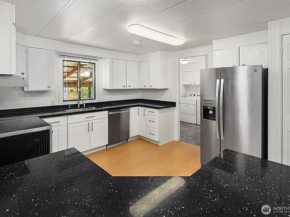 Step into this inviting home, where natural light pours in thru Lrg windows, creating a warm & welcoming atmosphere. Beautifully updated Kitchen features granite countertops, SS apps, under-mount sink. Vaulted ceilings elevate the open-concept Living & Dining areas, complemented by a wet bar. Spacious Primary Suite includes a ceiling fan, relaxing soaking tub, glass shower door & toilet updates. Enjoy the peaceful retreat of outdoor living w/ 2 Lrg private decks & handy storage shed. 7yr old roof. 2-car tandem carport provides covered parking. Located steps from assigned schools, public transit, & shopping, w/ quick access to I-5, Silver Lake, & Boeing Paine Field Airport. This home blends comfort, style, & convenience in 1 perfect package!