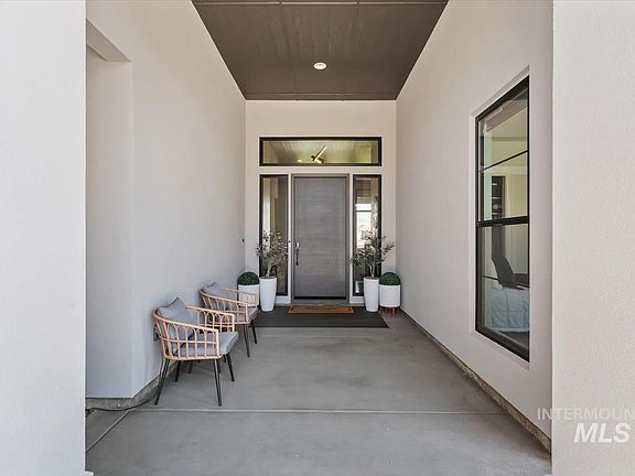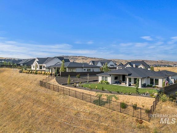 Perched in the scenic foothills of Cartwright Ranch, this contemporary home showcases architectural details that shine with bold, asymmetrical lines, beautifully softened by natural stone & wood accents. With 3 bedrooms, 2.5 baths, an office & a versatile flex room, the thoughtful design complements modern living. The great room, with soaring volume ceilings, frames elevated views of the Boise foothills. A gourmet kitchen showcases an oversized island, Thermador appliances & a Butler’s pantry. The primary suite is a retreat with designer feature walls, hardwood flooring & a spa-inspired ensuite complete with heated floors. The climate-controlled 3+ car garage impresses with epoxy floors, built-in cabinetry, motorized blinds & a 220V outlet for EV or workshop use. Outside, enjoy every season on the covered patio featuring a fireplace, surrounded by professional landscaping with fruit trees, blueberry bushes, water features & an outdoor shed—all with unobstructed foothill views and no backyard neighbors, ever.
