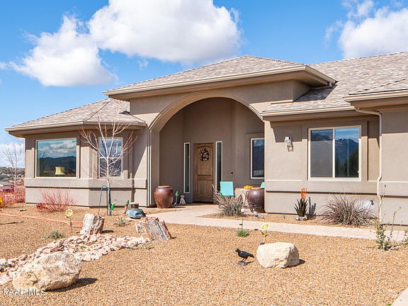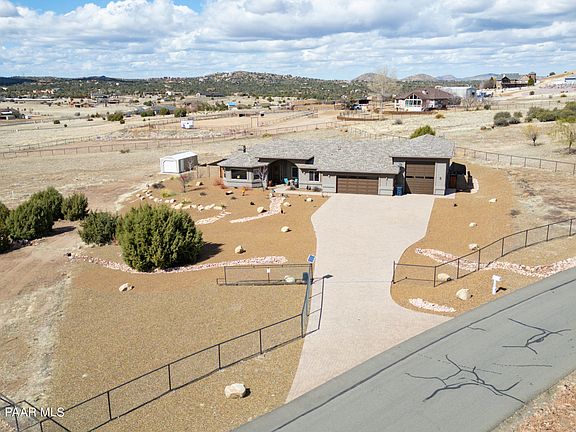 Single level contemporary horse property on 3+ acres with amazing long distance views in Williamson Valley Ranch.Home features open floor plan and 10 foot ceiling height and 8 ft. doors. Kitchen features marble counters, stainless appliances, full size pantry and custom cabinetry throughout.Fenced rear yard is perfect for pets plus the entire parcel is perfect for horse property with horse fence already installed.Garage space includes oversized 2 car garage plus a 20X50 RV garage with over 16 foot ceiling height, dump station and 50 AMP, 220 Volt power.Excellent well with 35+ GPM at last reading. Water conditioner in home. 2 sheds convey with home. Propane tank is leased. Gas to be prorated at COE.Professionally landscaped in front and rear yards with drip system.