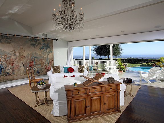 Spectacular Hamptons-style home at the end of a secluded cul-de-sac. Set behind a private gate that opens to a large motor court, the main house offers 4 bedrooms (one has been converted to an office) and 4.5 baths including a master suite with updated master bath. It features a gourmet kitchen, media room, study, gym and a great room with fireplace and wall of glass that opens to the veranda. The large yard with deck and rebuilt pool and spa is perfect for enjoying the 180 degree view from downtown to the ocean. There is also a 500+ square foot guest house above the garage with bedroom suite, full bath and kitchenette.