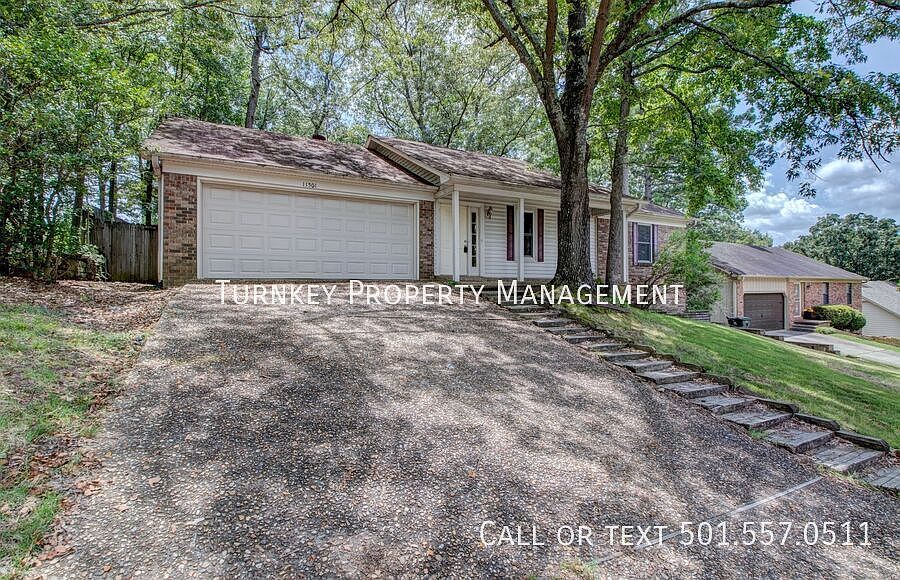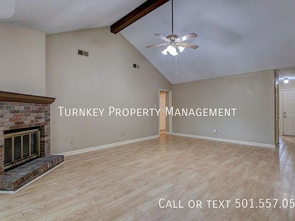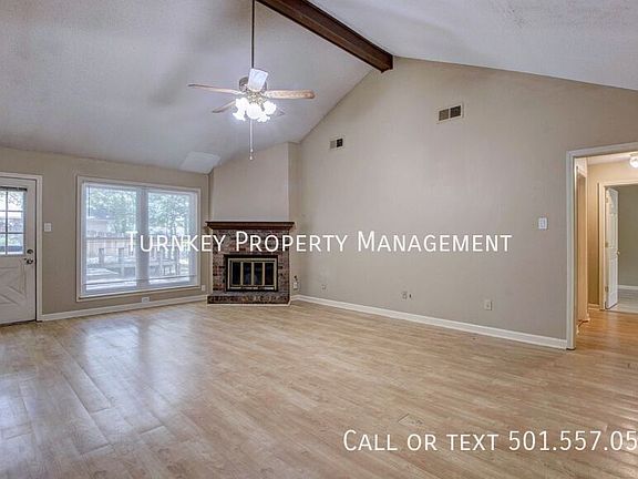 This 1785 sq. ft. single-story home in Little Rock, Arkansas, offers a blend of comfort and style. The living area boasts vaulted ceilings with exposed beams and a ceiling fan, creating an airy atmosphere. Light wood flooring throughout adds warmth and continuity. The kitchen features wooden cabinets and white appliances, while the bathrooms are equipped with modern fixtures. Large windows in the bedrooms allow for ample natural light. A brick fireplace in the living room serves as a focal point, adding charm to the space. The open floor plan seamlessly connects the living and dining areas, ideal for both daily life and entertaining guests. Fenced In Backyard Garage Pets Allowed Views