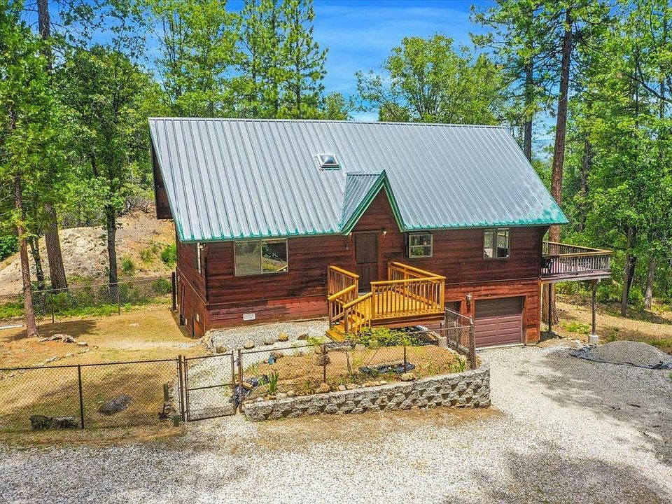 Super sweet and private Cedar Log home on a pretty 8 acre parcel with lovely scenic views. Only 10 minutes to South Yuba River Edwards Crossing recreation activities. This home has been owned as a special vacation home for 30 years of wonderful memories! Great open floor plan with vaulted open beam ceilings and loft to take in the views. Newer large deck for BBQ's and outdoor entertaining! Three bedrooms including the primary suite with view and lots of storage. Large attached 2-car garage with separate basement area for workshop or additional storage. Strong well including filtration system and 1700 gallon holding tank. Metal roof, New Lennox 96% efficiency propane furnace. New water heater. Fenced yard for the kids and dogs, plus a nice sunny area for a large garden or build a big workshop! Furnishings can be included! PLEASE TURN OFF THE LIGHTS.