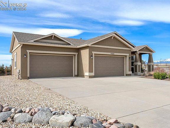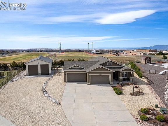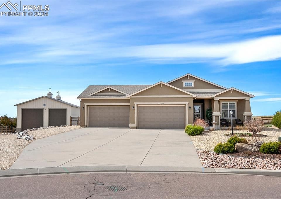 Welcome to your dream home nestled in the picturesque Paint Brush Hills. This oversized lot spans over 0.64 acres, and is impeccable landscaped both in front & in back. Located in a quiet cul-de-sac ensures privacy & serenity while no neighbors behind offers breathtaking mountain views! In the backyard a gardener's paradise awaits, complete with greenhouse & raised planter beds with drip lines. Entertaining is effortless on the expansive paver patio adorned with decorative pergola, offering ample space for gatherings & outdoor relaxation. The crown jewel of this property is then30x50 RV garage, boasting a fully finished & heated interior office space. Step inside the main residence, meticulously maintained & showcasing an open floor plan. The gourmet kitchen is a chef's dream, featuring an expansive island, double ovens & gas cooktop and an oversized pantry! Adjacent is the charming dining area with walk-out. Discover the well-appointed primary suite, generously sized and thoughtfully designed with convenient walk-out, a spacious walk-in closet & a 5-piece bath, complete with grand soaking tub & walk-in shower. The main floor also hosts an additional bedroom, full bath & laundry room. Natural stained wood flooring, granite countertops & custom window treatments adorn every corner, exuding warmth and sophistication. A stunning two-sided fireplace serves as the focal point, seamlessly connecting the living room to the back covered patio, creating an ambiance of comfort and relaxation. Venture downstairs to discover a fully finished basement, offering a spacious family room, complete with a gorgeous wet bar & custom wine room, perfect for entertaining guests or unwinding after a long day. Two additional bedrooms & spacious bathroom provide ample accommodation for family & guests. With an enormous 4-car attached garage complementing the RV garage, this residence effortlessly combines luxury, functionality & convenience. Colorado living in this one-of-a-kind property!