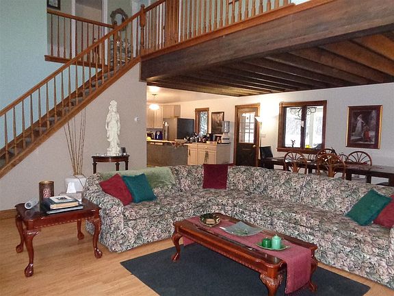 Your little piece of heaven! Home sits back off the road on a secluded wooded 10 acres setting. Spacious two story home offers over 3,000 finished square feet, open floor plan, 4 bedrooms with 3.5 baths, wrap around deck, finished basement and two large out buildings one with a loft will hold over 8+ cars!