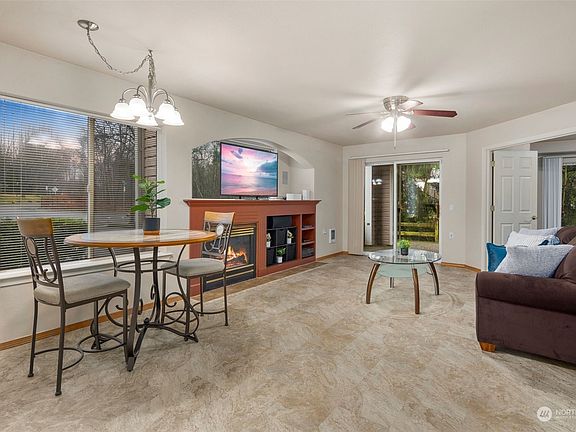 Welcome to this immaculate 2 bed, 1.75 ground-level, end unit condo! This property features an open floor plan, LVT flooring, cozy fireplace & surround sound in the great room. The updated kitchen includes granite countertops, stainless appliances including new dishwasher and refrigerator. For added privacy, bedrooms are on opposite ends, with private baths for each. In the primary suite, enjoy dual closets, walk-in shower and sliding door to the patio. Mobility accessible features include 3' doorways, an extra-wide entry hall and zero entry exterior doors. Outside, a large covered patio set against a greenbelt for added privacy. Private garage space + permit for a second car. Easy access to Paine Field, Hwy 99, I-5, & 405.