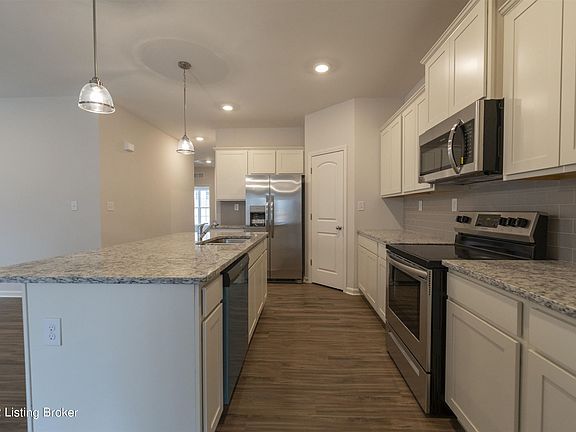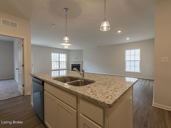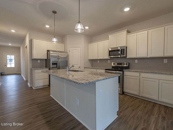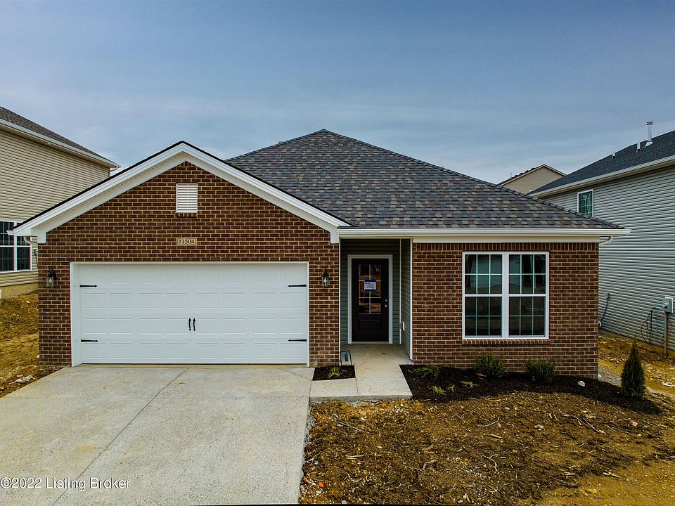The Gaines Mill is an open layout ranch plan with three bedrooms. This split bedroom design places two bedrooms and the hall bath off the entry, and the primary bedroom suite at the rear of the home. The central kitchen offers both a breakfast area and countertop dining at the island, and opens to the family room. The kitchen features white cabinets, granite countertops and stainless steel appliances. The primary bedroom suite includes a bedroom with large closet and spacious bath with tiled walk shower, window, and linen storage. The entry from the garage is a mudroom featuring a drop zone that adjoins the utility room on one side and the living areas of the home on the other.