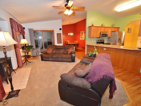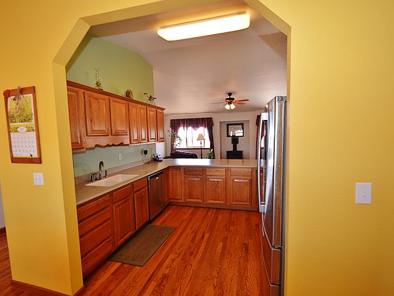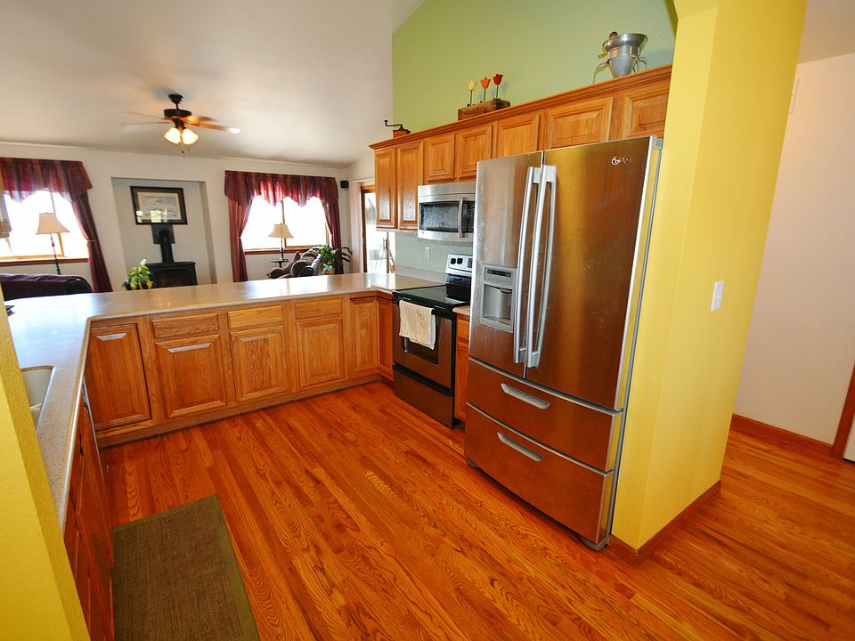 Great room concept w/ vaulted ceilings for the family living. Newer kitchen w/ an abundant amount of cabinets, Corian counters & stainless steel appliances. Large breakfast bar will accommodate up to 6 bar stools. Beautiful wood floors in kitchen, nook & dining room. Free standing gas fireplace heats up the entire room! Master bedroom features vaulted ceilings, 5 piece bath w/ tile floors and large walk-in closet. Other main level features include: 2 additional bedrooms, large laundry room, full bath & surround sound. New carpet in living room, master bedroom, and entire basement. Walk out to the 10' x 12' sun porch (not included in sq ft) a 12' x 19' covered patio & fully fenced yard. Great dog run area. The basement is grand w/ 2 bedrooms, a full bath & rec room to entertain in and will accommodate a pool table, Ping-Pong and game table. TV area w/ surround sound & so much more. Get organized with the 2 large storage rooms & huge crawl space. The xeriscaped front yard w/ trees & bushes, and the front covered porch gives this home great curb appeal. RV parking, walk to park & schools and the 1/2 acre lot makes this home a great find!