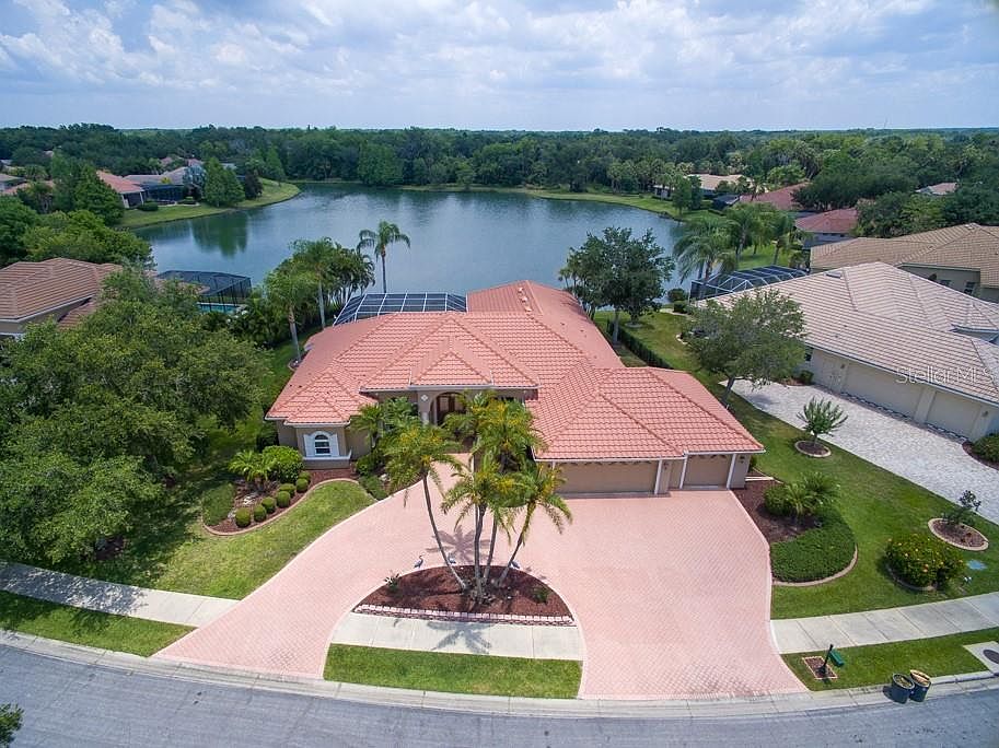 Welcome to this simply spectacular 3 bedroom 3 bathroom + office home nestled in the exclusive GATED community of River Wilderness Golf & Country Club. A grand paver circular driveway welcomes you upon arrival along with pristine landscaping. Interior features include; moldings, tray ceiling, plantation shutters, cherry wood floors, built-in wine bar and rack, 9 ft doors, and more. An elegant formal dining room off the foyer is perfect for entertaining. The spacious kitchen offers new granite, stainless steel appliances including a Sub-Zero refrigerator, white farm sink, and breakfast bar. The enormous master suite boasts an elegant tray ceiling, access to the lanai, a beautiful wood feature wall, amazing walk-in closet, and a spa-like en suite bath that was completely remodeled down to the studs. Exquisite bathroom features include; quartz countertops, a stand alone soaking tub with sparkling chandelier, Toto toilet,and incredible glass shower with dual heads and a rain shower! The gorgeous outdoor space features a newer saltwater pool and spa, expansive screened lanai with unique teak wood ceiling, travertine tile, and amazing outdoor kitchen! Truly an entertainers paradise! Enjoy peaceful pond views from every angle of your lanai. A second fenced outdoor space is perfect for kids or pets. Additional notable features/upgrades include; newer impact windows (2019), 3 car garage with extra storage unit (15x6), large indoor laundry room with storage and sink, 2 carrier 18 seer A/C with remote control infinite A/C system (2019), security system with cameras, and Ring doorbell. River Wilderness has two 24 hour manned guard gates and a community boat ramp on the Manatee River. Golf, tennis, pickleball, athletic and social memberships are available but are not mandatory. Dont miss this showstopper!