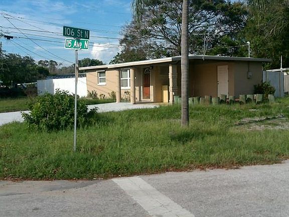 This large corner lot holds a surprise inside; but first notice the wide cement parking pad in front and the covered carport on the right. Just off that is a platform that can be used for grilling or porch sitting to visit with the neighbors. When you enter the house, there is approximately 30 feet of open living space with new floor tile, ending in a room with large glass windows on three sides. The cozy kitchen on the right wall has newer appliances and is open to the great room. To the left of the entrance are the two bedrooms - 11 x 10 and 8 x 8. There is window blinds and ceiling fans with lights in the bedrooms which have refinished laminate floors. The Master Bedroom has a shelf closet in addition to the hanging style closet. The completely renovated bathroom has both a tub and shower head. From the glass room you can have a total view of the backyard. The large fenced backyard has a cement pad for sunbathing or grilling, and a sidewalk to the access gate on the north side of the property which is bordered by 115th Avenue. This unique property is just off Seminole Blvd, a short distance south of the Largo Mall on Ulmerton Road. Measurements are approximate and should be verified.