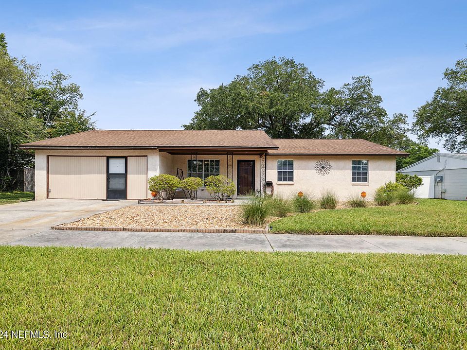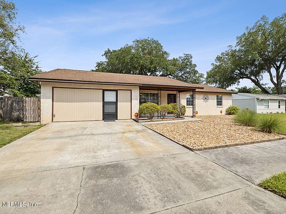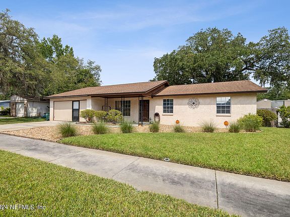 Cute and immaculate one-owner stucco-over-concrete block home with some nice updates under a 6 yrs young roof. Entering from the covered front porch, you'll find a 3 bdrm, 2 bath floor plan that flows from the entry to a Living Rm/Office/Flex Space behind double-French doors. Tile floors throughout lead to the Dining Rm with chair railing, and a Family Rm with stone fireplace that is open to a modern, redesigned Kitchen. You'll no doubt be impressed by the floating wood shelves, subway tile backsplash, breakfast bar, new lighting and cabinet hardware in the grey/white Kitchen. Fresh paint and new ceiling fans add to the home's charm. The former garage has been enclosed and is now an air-conditioned, newly carpeted Bonus Rm and Laundry with plenty of space for a billiard table, ping pong, hobbies, etc. A small screen porch, covered patio and a large storage shed for all your tools, toys and misc. are located in the good-sized fenced backyard of this well-cared for Mandarin home. Very close to A-Rated Loretto Elementary School, shopping and dining.