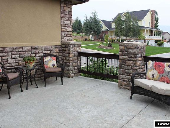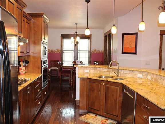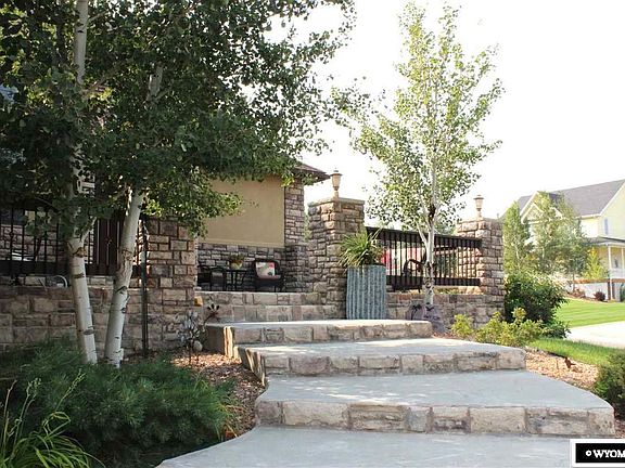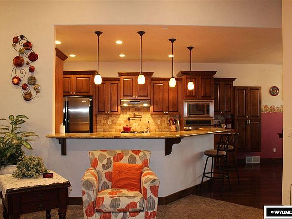 Beautiful Custom Home with lots of upgrades, including granite in kitchen & baths, stained Knotty Adler trim work and doors, vaulted ceilings, hardwood floors, dining room, main floor laundry over sized double car garage on a corner lot. This open floor plan offers 5 bedrooms, 2.75 bathrooms, sun room finished basement with wet bar. Front porch and back patio. Great views of Casper Mountain and no neighbors behind you.