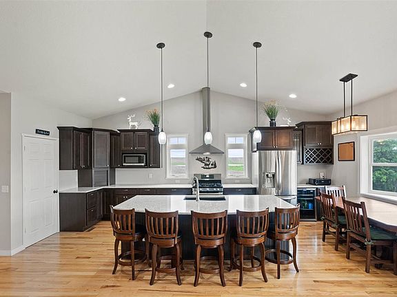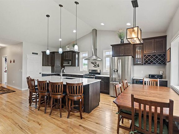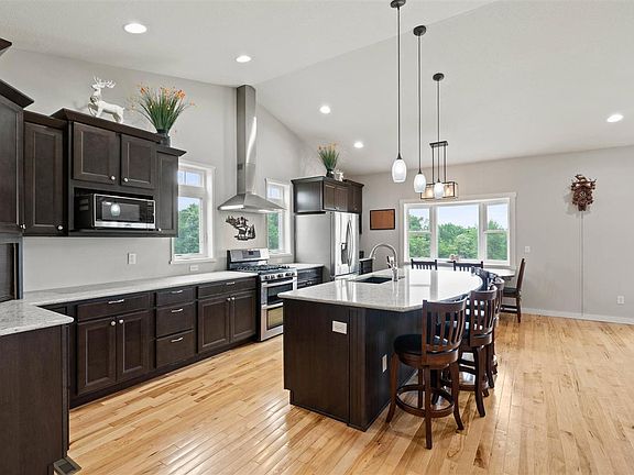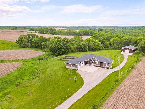 If you have been looking for a Washington County acreage, this is the one for you! Featuring 6.05 acres, 5 bedrooms, 3 bathrooms, a fantastic outbuilding and over 3,300 sq ft, this is not a property you want to miss! Upon entering this stunning home you will find an open concept main level living space featuring a gas fireplace with a unique tile design, adding a touch of elegance and warmth to the space. The kitchen is a chef's delight, featuring dark cabinetry with soft close drawers and numerous built-in features, solid surface counters, gas stove, large pantry, wine fridge, and a new dishwasher installed in 2022. Exquisite hickory floors run throughout the main level creating an elevated design. Expansive main level primary bedroom boasts tray ceilings and his and her closets. Attached primary bathroom offers a double vanity, detailed tile shower, and luxurious soaker tub. Access the expansive wood deck off the primary bedroom and main living space and enjoy the serene outdoor space. A second bedroom and full bathroom are also located on the main level. The convenience of a main level laundry room with a sink, folding and hanging space right off the 3-car garage makes household chores a breeze. The finished walkout lower level adds even more living space for you to enjoy. With a large family room, three additional generously sized bedrooms with walk-in closets, a full bathroom, and an expansive storage area, this home has space for all of your needs. The excellence continues as you step outside onto this 6.05 acre property with 0.67 acres located in CRP. 40x64 steel building features concrete floors, three overhead doors, 2 horse stalls, and a tack room. The pasture area is fenced in and ready for your animals. With solar panels and geothermal heating on the property, you are able to experience lower monthly expenses! Don't miss the opportunity to make this exceptional property your new home!