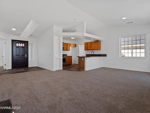 All the hard work has been done for you in this immaculate in-town home that backs up to beautiful pasture land with unobstructed views of the Sierra Nevada and Pinenut mountain ranges. All new carpet, interior and exterior paint and new roof installed in 2025. Granite countertops, GE Café oven/range, Bosch dishwasher and a single-bowl stainless steel sink adorn the kitchen. Low maintenance, single-level living with artificial turf and a paver patio in the back yard and the HOA maintains the front landscaping. There is also a pad and electrical disconnect (just needs breakers) for a hot tub in the rear. Additional features include built-in speakers in the living room; skylight in the entryway, gas and electric dryer hookups