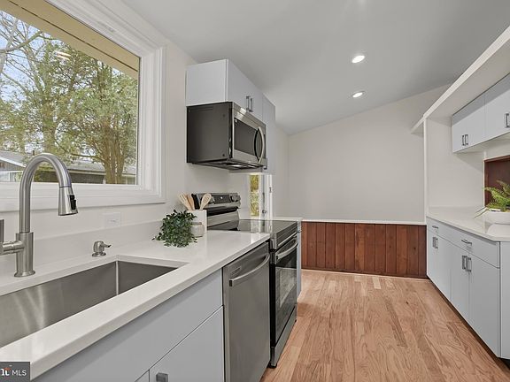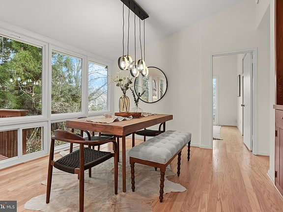 Beautiful and rarely available, renovated , Mid Century Modern jewel designed by the renowned architect, Charles Goodman, located in historic Hammond Woods! Designated as a historic neighborhood by the National Register of Historic Places, Hammond Woods offers 58 contemporary single family homes nestled in a tract of heavily wooded, rolling land. The house retains the characteristic Goodman charm with vaulted ceilings, floor to ceiling windows, exposed brick wood burning fireplace with built in wood storage, wide chimney and paneling among other features while being paired with updated, style-appropriate finishes. Upon entering the home you are greeted by the open concept living and dining room combination, perfect for both entertaining and everyday convenience; this comfortable space is highlighted by the cozy fireplace, hardwood flooring that flows through the home, a cathedral ceiling, and beautiful wall of windows. Prepare your favorite recipes in the kitchen boasting stainless steel appliances, sleek gray cabinetry, quartz counters, and a breakfast bar. The main level hosts two bedrooms, including the primary, and a full bath accented by subway tile and a modern globe lighting fixture. The lower level is quite accommodating providing a sizable family room with an additional wall of windows, a third bedroom, and a full bath with glass enclosed shower. Enjoy the generously sized lot with mature trees from the side deck or back stone patio. Great location with nearby parks, shopping, entertainment, Wheaton Metro and access to commuter routes including MD-200, I-95, and I-495. Property updates: renovated kitchen with quartz countertops, new appliances & cabinetry, renovated bathrooms, new hardwood floors, and updated lighting package with recessed lighting throughout the home.