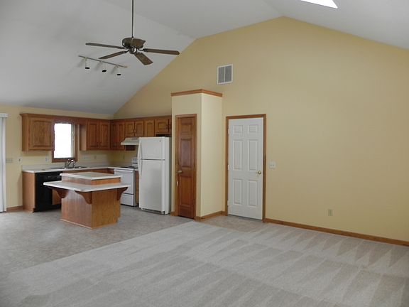 Beautifully landscaped exterior with lamp posts lead to front door. Enter foyer with huge coat closet to your beautiful 21 x 15 Great Room with cathedral ceiling, 2 sky lights and triple windows providing lots of natural light. Dining room features 6 ft. sliding door for full view of your private patio and wooded back yard bordered by a creek. Kitchen has a window at your double sink to view private rear yard, island with breakfast bar, pantry, under and over-cabinet lighting, dishwasher, refrigerator with ice maker, new range and disposal. Large 14 x 14 master bedroom in rear for privacy has vanity area, walk-in closet and adjoining bath. Full bath off hallway serves guests and second 11 x 11 bedroom. Other features include linen closet, generous laundry room with both gas and electric dryer hookup and wall cabinets. Recent upgrades include fresh paint, carpet, flooring and window coverings. Oversize 1 ½ car garage has second attic access with stairs, garage door opener and measures a generous 15 ft wide by 31 ft. deep. Gas furnace and water heater. Newer water softener. Neighborhood features two beautiful private fishing lakes and lots of walking paths. Lawn service, street snow plowing and common area maintenance provided by HOA. Seller is a licensed realtor.