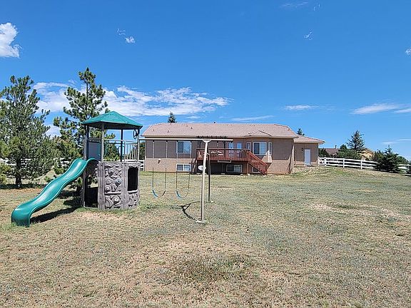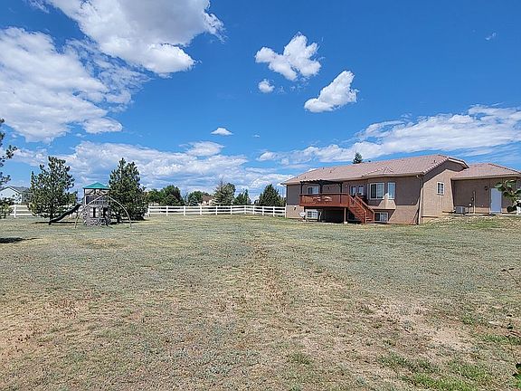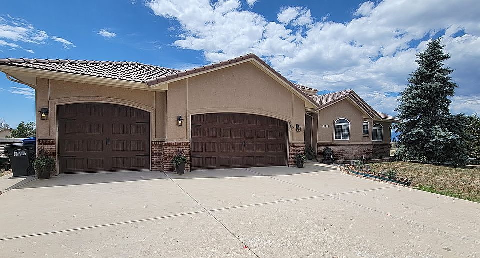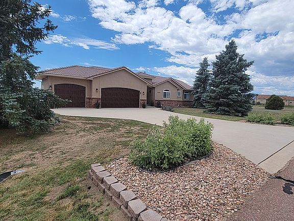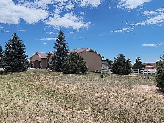 Lots of elbow room with this beautiful 3,300 square foot rancher with a finished garden level basement. Home is situated on a 1.02-acre corner lot with lots of trees in Woodmen Hills. Excellent unobstructed views of Pikes Peak & the Front Range. Stunning stucco and brick exterior with a tile roof gives this home eye-popping curb appeal. 5 carpeted bedrooms, 4 tiled bathrooms, and a spacious 758 square foot insulated 3-car garage with gas heater and thermostat. Home features vaulted ceilings and wood floors on the main level living area and kitchen with higher-than-normal ceilings in the main level bedrooms. Primary suite / bedroom with a full bath, walk-in closet, and an additional storage closet. Secondary guest suite / bedroom with its own full bath and walk-in closet. Third upstairs bedroom has a large closet and a private entrance to the main full bath. Large, carpeted family room in garden level basement with wet bar, cabinets, and minifridge. Bonus/recreation room/office (could easily meet requirements for 6th Bedroom) with rugged vinyl plank flooring. 2 additional roomy carpeted bedrooms in the basement. 3/4 bath in basement with tiled shower and flooring. Sizable unfinished storage/utility/laundry area in basement. Large dog friendly fenced rear yard. Store your RV, Trailer, Boat, or other toys on site. Granite countertops in kitchen and bathrooms. Upstairs laundry closet/pantry plumbed for a small washer and ventless dryer. Additional laundry hookups in storage room in basement (gas and electric). Window well covers. Air Conditioning. New garage doors/tracks/opener (2021). Newly painted fascia, soffits, door trim (2022). Easy access to Woodmen Hills recreation centers, shopping, Schriever and Peterson AFB. Simply perfect...