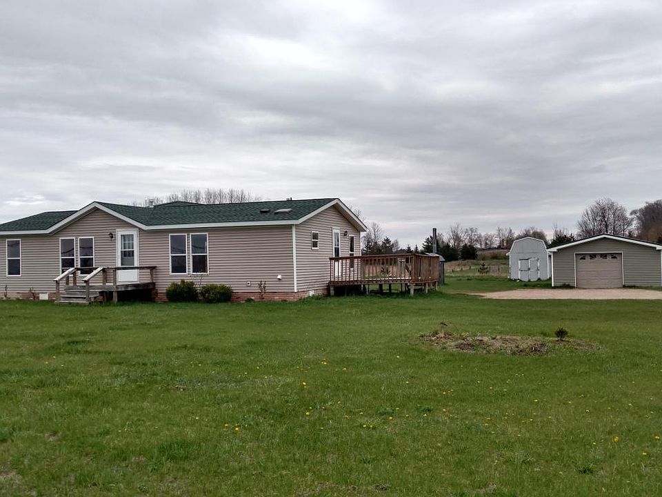 Nice Doublewide on 6 Acres with 2 decks (1 has a roof over it). Outside furnace, natural gas on paved road only 1.5 miles to Montabella Schools.