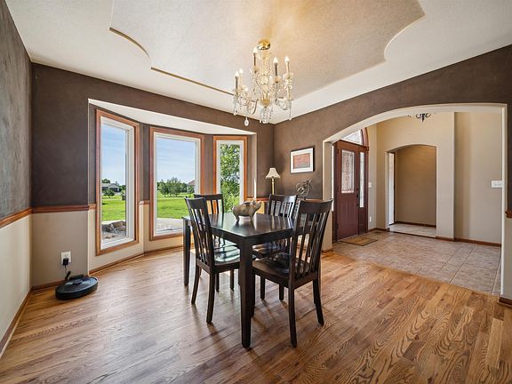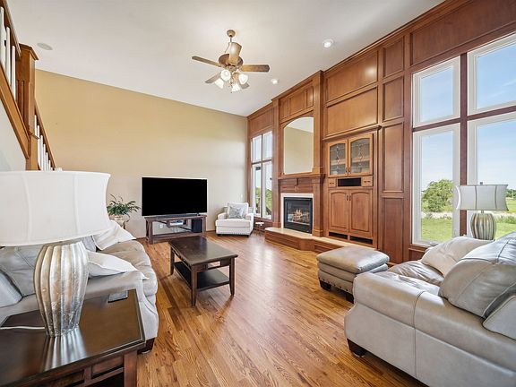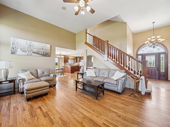 If you're searching for a spacious home on acreage close to town, complete with an outbuilding and a pond, look no further! This classic 1 ½ story home offers everything you desire in a suburban retreat. As you enter through the leaded glass door, flanked by matching sidelights and a round-top transom, you step into a large entryway with a stunning two-story ceiling. This entryway opens into an impressive great room, featuring a completely wood-trimmed back wall with two sets of double windows with transoms, a gas fireplace, an entertainment center, a wood floor, and a ceiling fan. Opposite of the entryway, you'll find a sharp formal dining room with a bay window, tray ceiling, and wood floor, perfect for elegant gatherings. The cook in the family will love the open kitchen, boasting granite countertops, two lazy Susans, a glass display cabinet, wood floor, and full appliances including a double oven. The kitchen seamlessly connects to a fantastic everyday dining area with a large window, triple Atrium doors, and a wood floor. Off the kitchen is a convenient ½ bath with a pedestal sink, and laundry will be a breeze in the large main floor laundry room with cabinetry and a window. The master bedroom is a true retreat, featuring a high coffered ceiling, triple Atrium doors, and a see-thru gas fireplace. The relaxing master bath offers a corner Jacuzzi tub with a see-thru gas fireplace above, a large updated shower with a standing massage, an oversized double vanity with decora mirrors, tile floor, and a large walk-in closet with sweater racks and a window. As you ascend to the second floor on the open rail stairway with wood library panels, you're greeted by a large hallway leading to three spacious bedrooms and a full bath with double vanities, a tub with a tile shower over, a window, and a tile floor. The basement family room is perfect for hanging out, featuring view-out windows, a gas fireplace with a brick face, a game area with doors to the walkout patio, and a spectacular wet bar with a raised tile top, a back bar with a mirror, wine rack and a recessed refrigerator space. There's also a super office/bedroom with a French door entry and triple view-out windows, plus an additional bedroom with a daylight window and a full bath with an oversized vanity and a wet room with a tile floor. The oversized, side-load three-car garage measures 32x34, is completely drywalled and painted, windows, and includes openers. For all your four-wheel toys, there's a fantastic 28x36 outbuilding with 2x6 sidewall construction, 14ft sidewalls, 10x12 and 9x7 overhead doors, walkthrough door, 4 windows, and electrical. Finally, you can relax around the L-shaped pond and even raise your own fish, making this property a true suburban paradise. Don't miss this rare opportunity to own a magnificent home with all these exceptional features!