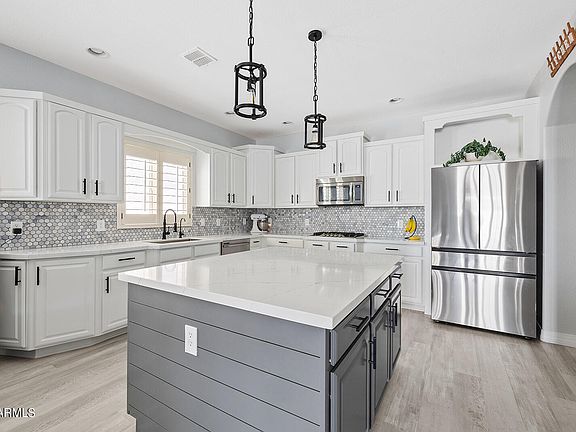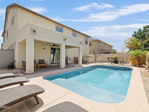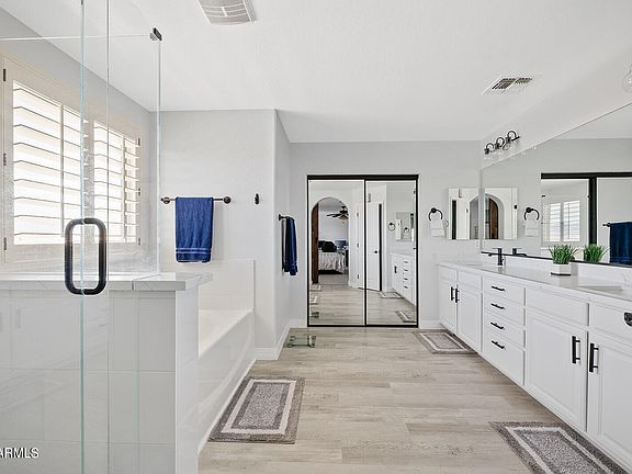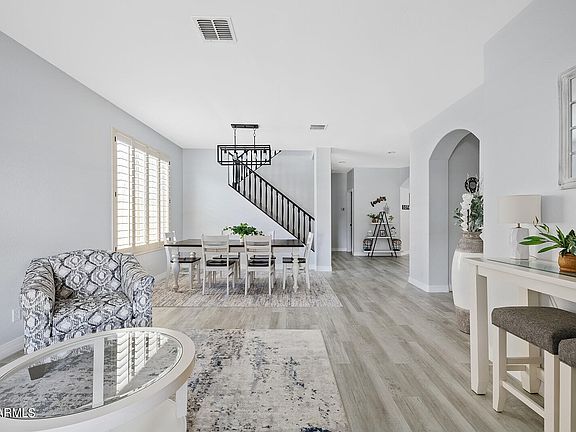 Introducing a truly exceptional newly updated home situated in a highly sought after area in Mesa. The charming curb appeal with brick accents and a welcoming porch invites you to relax and unwind.Throughout the home, experience the embrace of newly upgraded LVP flooring and carpet that exude modern charm. Fresh interior paint that brightens up every room, while plantation shutters create an atmosphere of timeless elegance. Step into culinary paradise with the heart of this home - a kitchen that is as functional as it is beautiful. Shiplap island accents and two-toned cabinets create a delightful contrast, perfectly complemented by the stunning quartz countertops.(CLICK FOR MORE) Top-of-the-line stainless steel appliances, including a dishwasher, double wall ovens, and a gas cooktop, provide the tools for culinary mastery. The reverse osmosis system ensures the purest water quality, and the black faucet adds a touch of elegance to the single basin stainless steel sink. Modern pendant lights illuminate the space, while black hardware and soft close cabinet doors add a touch of sophistication. The modern backsplash ties the entire look together, culminating in a space that is both stylish and functional. The massive walk-in pantry is a dream come true for those seeking ample storage solutions.Upstairs, the master suite is a haven of relaxation and luxury. Enter through a custom barn door adorned with iron accents, into the newly upgraded bathroom that boasts a frameless shower door, a meticulously tiled shower, and an inviting massive tub, creating a spa-like atmosphere. Quartz countertops, dual sinks, and executive height cabinets offer both convenience and style. The spacious walk-in closet provides an abundance of storage and organization options. Additionally the loft space promises an immersive entertainment experience with its surround speakers. Each bedroom is perfectly sized and all feature walk-in closets for added convenience. One bedroom even boasts an ensuite bathroom. The backyard is a true paradise with its brand new sparkling pool complete with a massive baja step and an umbrella sleeve. The covered patio is the ideal setting for all your outdoor gatherings. A few other aspects you will love about this home are the utility sink in the laundry room, tankless water heater, epoxy garage flooring, matching quartz countertops on all the surfaces, and upgraded fans and lighting throughout. With an immense amount of storage, thoughtfully designed features, and luxurious upgrades throughout, this home offers an unparalleled living experience. Don't miss your chance to make this home!