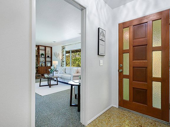 The covered front porch is inviting. The living room is spacious and has decorative built-ins and a retro fireplace. The dining room can support a large table and has a sliding glass door to the backyard. The galley style kitchen has tons of cabinets and counter space. At the end of the kitchen is the pantry area and a large laundry room.
