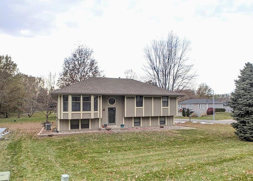 Awesome value for this great split entry home on a large corner lot! Masonry fireplace in living room with vaulted ceiling and skylights. Wood look floors in Kitchen and large Dining Area. All appliances stay! Master Bed has huge walk-in closet. Walkout Basement is finished and has built in bar/seating area. Extra deep garage has cabinets for storage and a sink. Needs a little bit of paint and it'll be like new!