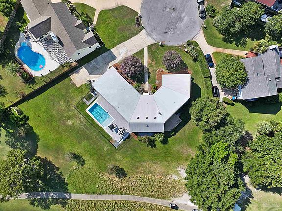 Discover effortless Florida living in this beautifully updated 5BR/3.5BA home tucked away on a quiet cul-de-sac in Tiger Point Village, Gulf Breeze. Set on over half an acre, this single-level home blends timeless design with modern updates and golf course charm. The heart of the home is a chef-inspired kitchen featuring stainless steel appliances, custom cabinetry, and a large eat-in island that opens to a light-filled living area—perfect for everyday living and entertaining. A spacious flex room adds versatility for a home office, playroom, or media space. The split floor plan offers privacy for guests or an ideal MIL suite with its own backyard access. The primary suite is a private retreat with a walk-in closet, patio walk-out, and spa-style bath with dual vanities, soaking tub, and walk-in shower. Enjoy outdoor living year-round with a lanai, open deck, and sparkling saltwater pool, all overlooking the golf course. Located minutes from top-rated Gulf Breeze schools, shopping, dining, and the white-sand beaches of the Gulf Coast. Move-in ready, stylish, and serene—this one checks all the boxes.
