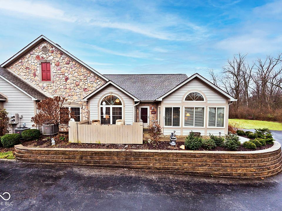 Here you Go! This tucked away, Updated Beautiful condo features 2BR, 2BA's, with Vaulted ceilings & nestled within a low maintenance community! Perfect convenience to 31 and 135! Cozy up by the gas log fireplace in the spacious family room or enjoy a Sun drenched, Sunroom with beautiful marble tile flooring! Other amenities include Custom Zinga 2" Blinds, Office space (or addl den), Laundry room with its own pantry space, Plentiful white cabinets in kitchen w/solid surface counter tops, & 1 yr old refrigerator! With NO CARPET, you'll LOVE the newer upscale laminate that flows seamlessly throughout this home! The Finished Garage with storage AND work room is a MUST SEE! You'll be "Spring Ready" with a spacious patio area and Beautiful landscaping with Plentiful Perennials. This Private & Move In Ready home features EXTRA Parking & Overlooks the WOODS! Seller has spent over $49,000 in updates including Pella Thermal Windows (2018), Water Heater (2023), Primary Shower replacement (2017), HVAC (2015), Water Softener (2015), Upscale Laminate Flooring throughout (2021), and MORE! (See List in home!), Roof (HOA placed 2021). HOA AMENITIES include Roof, Outer Walls, Lawn Care, Snow Removal, Pool, Clubhouse, Water, Sewer, & Trash! Make this carefree living home your next chapter!