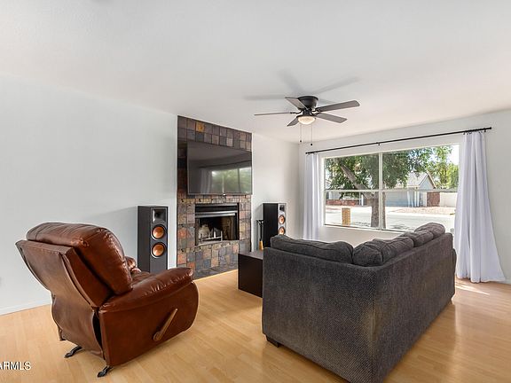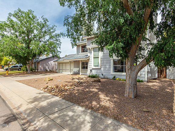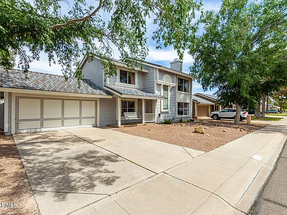 Refreshed and back on the market! This home offers a newly resurfaced pool, deck, patio cover, bathroom vanities, countertops, interior paint and fixtures. Inside you'll find an abundance of natural light, laminate/tile flooring, & a perfectly-sized living room w/a slate stone accented wood-burning fireplace. Gorgeous eat-in kitchen boasts wood cabinets, chic pendant lights, tile backsplash, granite counters, built-in appliances, & a bi-level island w/breakfast bar & butcher block counter. Continue upstairs to discover the bedrooms & vaulted ceilings! Romantic primary suite has French entry doors, an ensuite w/glass-block shower & access to a private balcony. Don't miss the full bathroom & well-sized den w/built-in desk downstairs! Large backyard provides a covered patio, sparkling pool, an above-ground spa & artificial turf. Prime location, close to shopping, entertainment and freeway access. Chandler School District. Must See