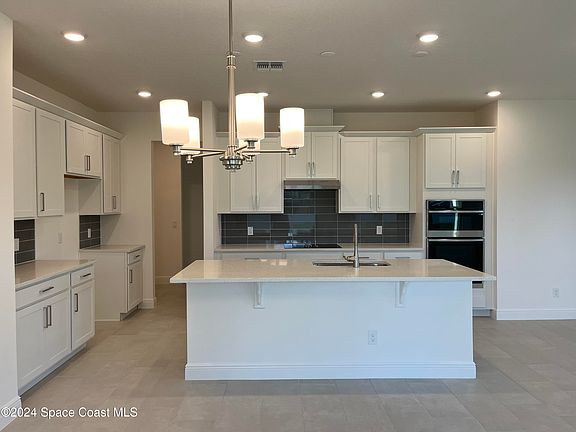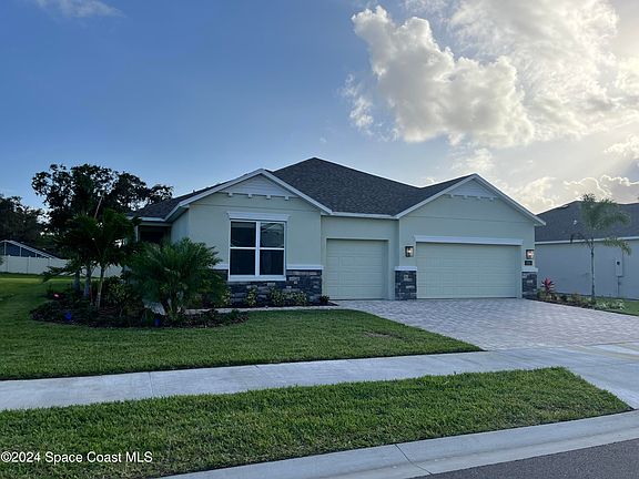 Our exceptional Longleaf French Country plan features an open-concept design with 4 Bedrooms, 3.5 Baths, 3 car Garage and is located in the desirable Country Club Estates Community. Spacious Great Room overlooks expansive covered rear Lanai - perfect for entertaining and outdoor living. Beautifully appointed Kitchen features 42'' upper cabinets with crown molding, quartz countertops, tile backsplash, and stainless appliances. Tile flooring featured throughout main living areas, with carpet in bedrooms. Our High Performance Home package is included, offering amazing features that provide energy efficiency, smart home technology, and elements of a healthy lifestyle. This gated community is a hidden gem in NE Palm Bay near Palm Bay Road and I-95 with quick access to Hammock Landing, major employers, schools, shopping centers, and Restaurants. The mature trees in the community provide natural beauty and shade. Community is just 20 minutes to the the beach!