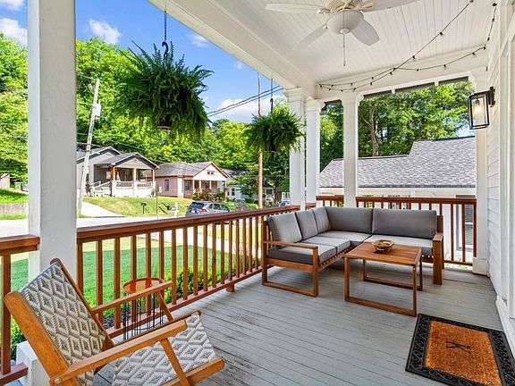 Exposed wood ceiling beamsWarm hardwood floorsCovered front porchOpen-concept dining areaAbundance of natural lightStainless steel appliancesExpansive backyard