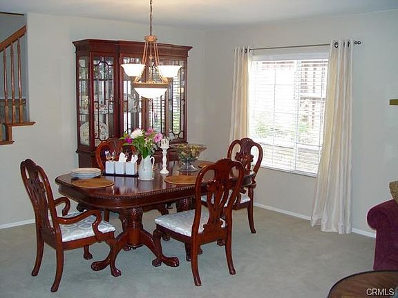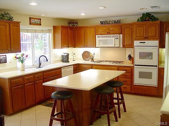 Welcome to Crescent Grove in South Corona. 3,103 sq. ft. surrounds 5 bedrooms and 3 full baths. Formal living & dining combo. Gourmet kitchen has Corian counters, double oven, 5 burner stovetop, microwave hood, under-cabinet lighting, walk-in pantry & large food-prep/serving island. Decorator tile in the entry, through to the kitchen and all bathrooms & laundry. Spacious family room has fireplace with rock facia and mantle & surround sound speakers. Large master suite & bath with 2 walk-in closets, deep tub & clear glass step-in shower. 1st floor bedroom has ceiling fan, full bath and is configured as a library/office with Murphy bed (negotiable). All 2nd floor bedrooms have ceiling fans and walk-in closets. Upstairs laundry room has utility sink & full upper & lower cabinets. Back yard has a large covered patio area overlooking a very tropical custom rock pool featuring a waterfall, relaxing in-ground Jacuzzi, warming fire pit & Barbecue close by. The back yard has accent lighting. 3 car drive-thru garage with built-in cabinets, work bench & storage shelving. Upgrades such as dual A/C units, wood blinds, surround sound speakers and more... Community pool, spa & playground are close-by. This beautiful home is turnkey and ready!