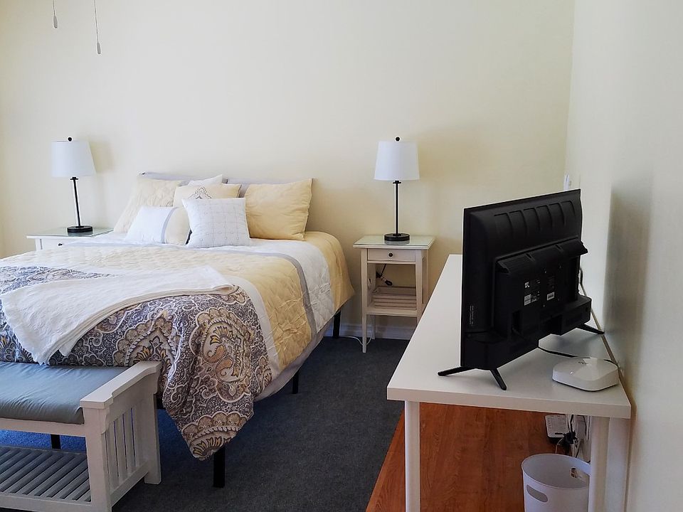 Completely private master bedroom with private en suite bath and private entrances. There is also a private patio for your enjoyment that looks out on the pool & spa area. Room has been recently redone with new queen bed with deluxe hotel mattress, large work space for your convenience and has 32" smart TV for your enjoyment! One bedroom house, HUGE closet area and plenty of extra storage in your private bath. Plenty of free, always available street parking, no smoking. Lease is listed as month to month BUT landlord is very open to long-term renters. You'll be responsible to clean up after you use the kitchen and empty your trashcans if they're full before housekeeping occurs. No smoking.